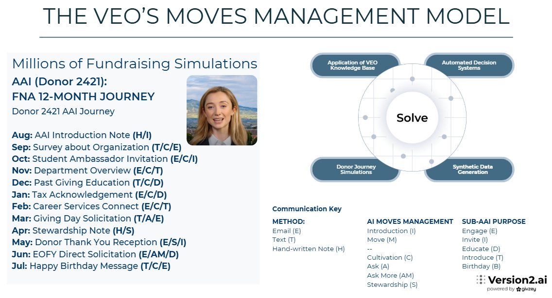 The Virtual Engagement Officer (VEO) uses autonomous AI to independently manage donor relationships through a series of 8–12 touchpoints annually, guiding donors toward the natural outcome of giving.